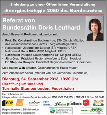 An dieses Referat anknüpfend diskutieren mit Jacqueline Badran (SP), Hans Killer (SVP) und Philippo Leutenegger (FDP) gleich drei Nationalräte gemeinsam mit den Präsidenten der beiden Regionalkonferenzen Zürich Nordost und Südranden, Jürg Grau und Stephan Rawyler, über Chancen und Konsequenzen der skizzierten Energiezukunft. ETH-Professor Konstantinos Boulouchos wird dabei als Mitglied des wissenschaftlichen Beirats «Energiestrategie 2050» dabei die fachlichen Aspekte kompetent vertreten. Moderiert wird die Podiumsdiskussion von Wälz Studer.