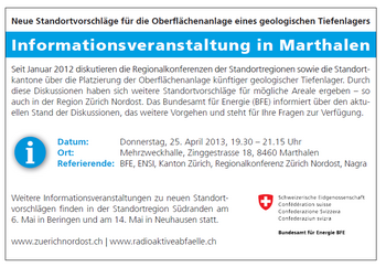 Am 25. April 2013 hat in Marthalen die Informationsveranstaltung über die neuen Standortvorschläge stattgefunden. Zum Prozess, sowie zu den neu vorgeschlagenen Standortvorschlägen haben referiert: BFE, ENSI, Kanton Zürich, Regionalkonfenz Zürich Nordost, Nagra.